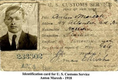 In 1917, Anton registered for the World War I draft in Brooklyn, New York. He gave his address as 40 Atlantic Avenue. At that time he was a captain of a scow, signing his name as Antonio Maresh. In April of 1918, he registered with the U. S. Customs Service in the Port of New York, signing his name as Anton Maresh, 49 Atlantic Ave, Brooklyn, N. Y., his occupation was unemployed seaman. In May 1917, he joined the Tide Water Boatmens Union, Local 847 of the International Longshoremens Association, signing his name as Antone Maresh. When the paymaster at the Port asked his name, he gave it as Antone. The paymaster called him Anthony, the name he went by from that time forth, using the nickname, Tony.